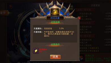 天星技能:攻击时,1%的可能性使伤害加成提升20%,持续5秒,冷却时间为60秒。
