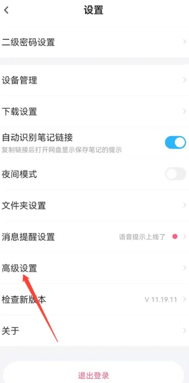 在百度网盘我的中往下拉找到设置并点击,然后在列表中点击高级设置。