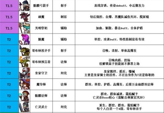 T2:魅魔、哥布林投矛手、哥布林预言者、皇家守卫、魔导师、骷髅法师,亡灵骑士