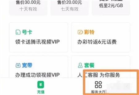 3.来到充值界面后,在右下方位置点击“服务大厅”的入口。