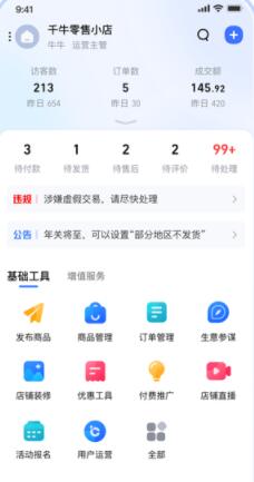 3)新增官方工具,覆盖店铺经营全链接:开店、商品、交易、退款、评价、账号管理、活动报名等;
